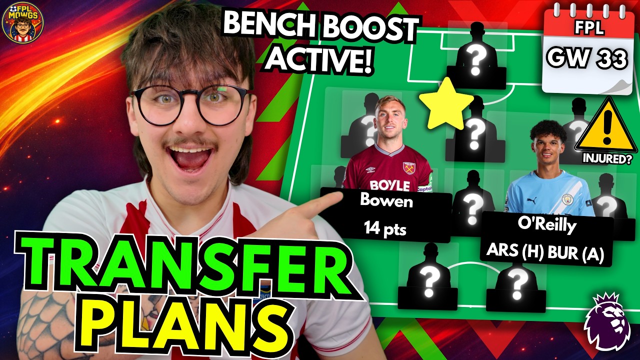 FPL GW 33 TRANSFER PLANS 🚨 | BENCH BOOST ACTIVE πŸƒ O’REILLY INJURY?⚠️ & SELLING BOWEN?!😬| FPL 25/26